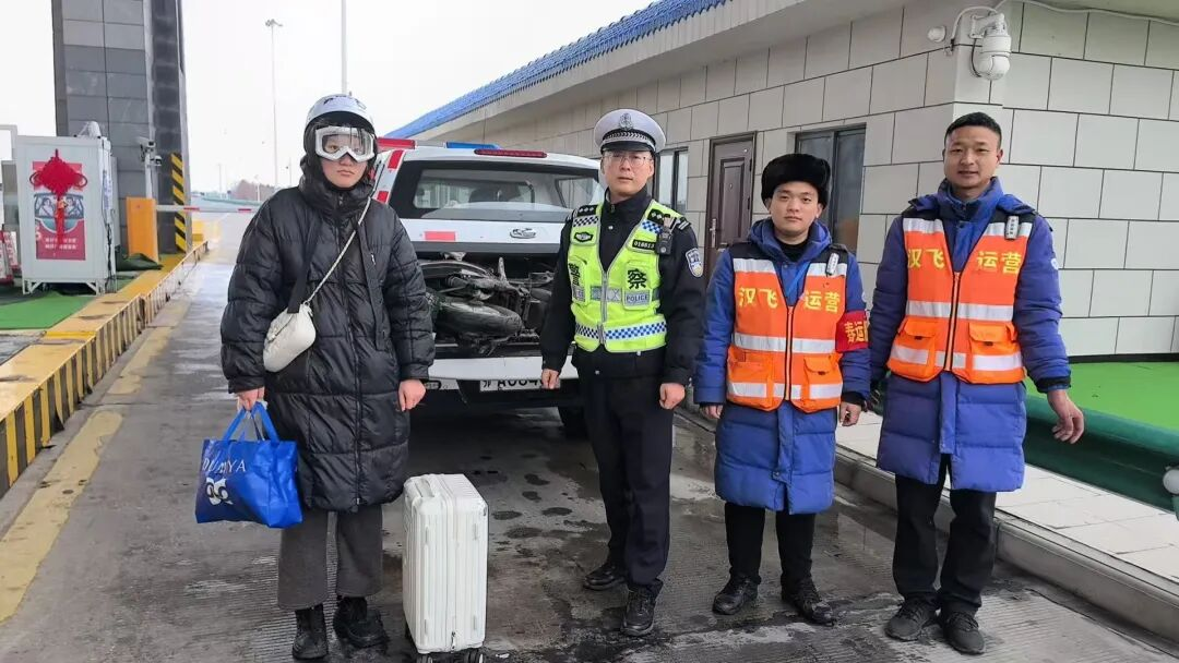 得知这一情况后,李海军耐心告知该女士高速禁止非机动车行驶,并立即联系执勤交警。待交警赶到现场,站点工作人员与交警合力,小心取下她的行李箱和年货妥善放置,再将电瓶车平稳抬上警车后备厢,让她坐上警车避雨。该女士临行前连声道谢:“大过年的遇到你们,真是太暖心了!”