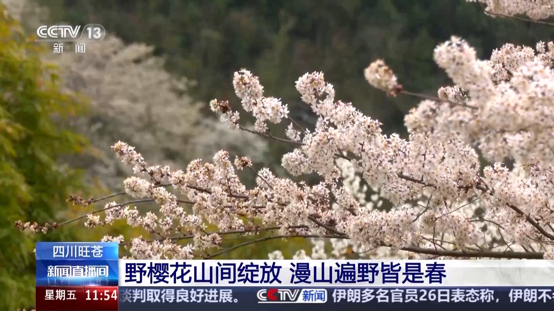 春意渐浓,多地赏花游持续升温,在四川广元旺苍县的山野间,野樱花迎春绽放。