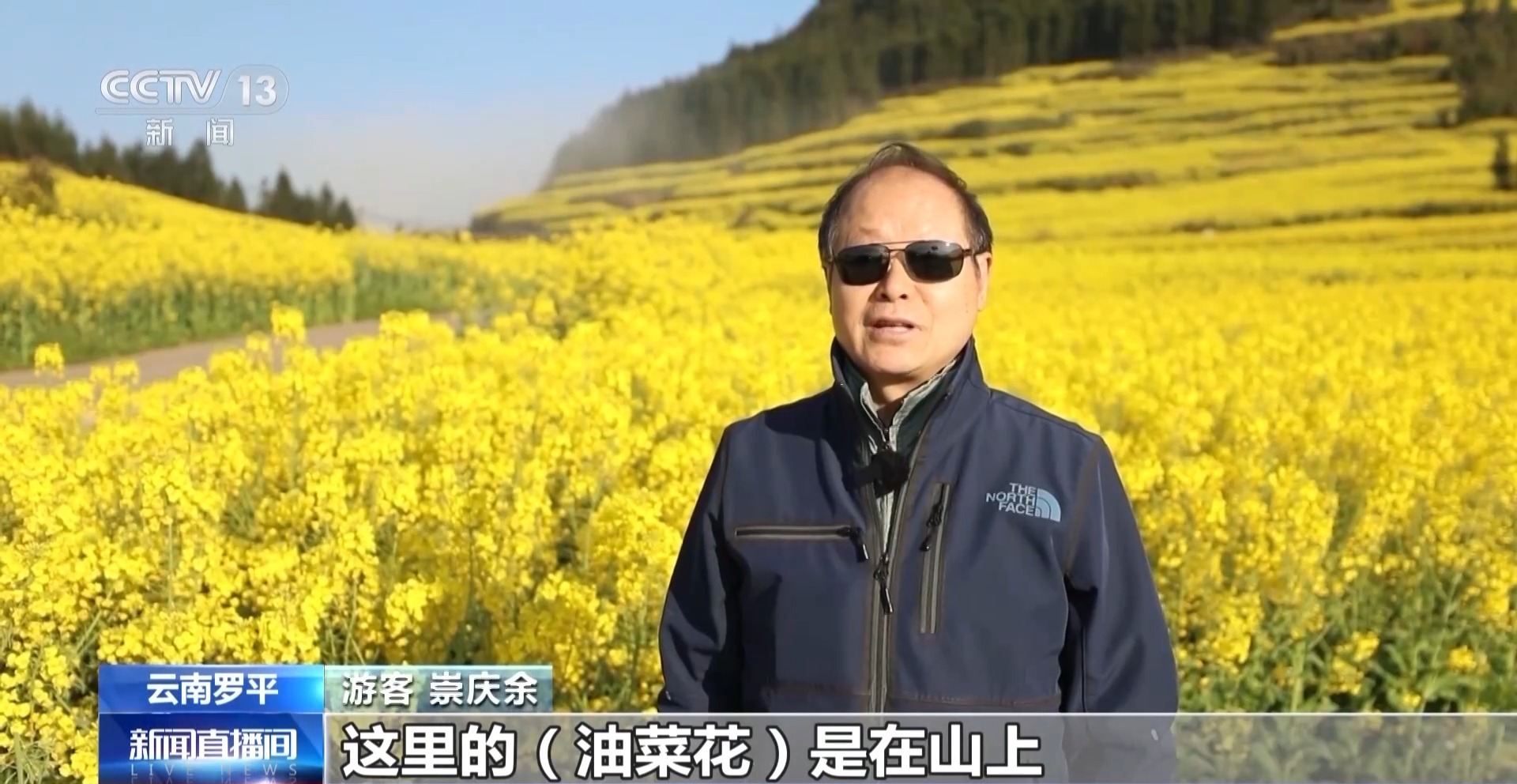 游客 崇庆余:这里的油菜花是在山上,一层层梯田推进,一片片的花海向山上延伸,非常壮观,非常好。