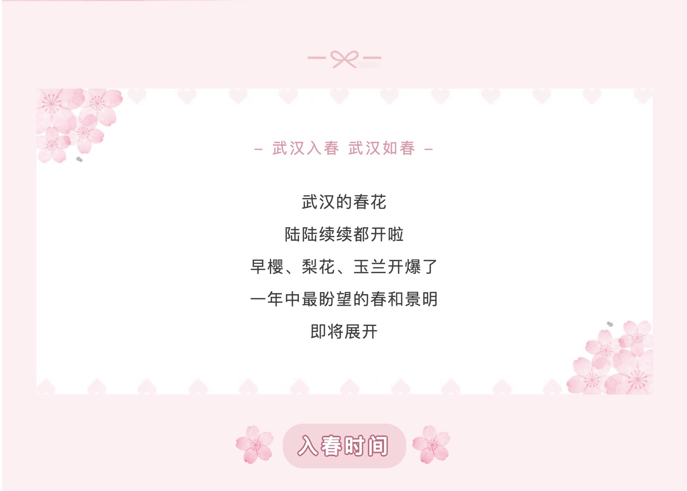 以武汉国家基本气象观测站为例,武汉已于2月19日正式进入气象学意义上的春天。此次入春时间较常年入春时间(3月5日)偏早14天,为近20年第3早。也就是说,在马年春节期间,满城春意就已悄然上线。