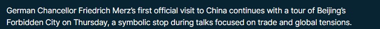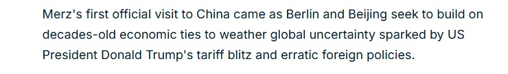 法国24新闻台26日报道称,默茨总理首次对中国的正式访问,恰逢德国和中国正努力巩固数十年来建立的经贸关系,以应对美国滥施关税政策造成的冲击及其反复无常的外交政策引发的全球不确定性。