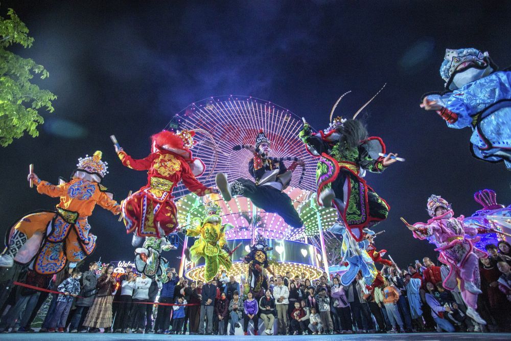 2026年2月19日,英歌舞队在广东省佛山市高明区滨荷Park生态文创园街头巡游表演。