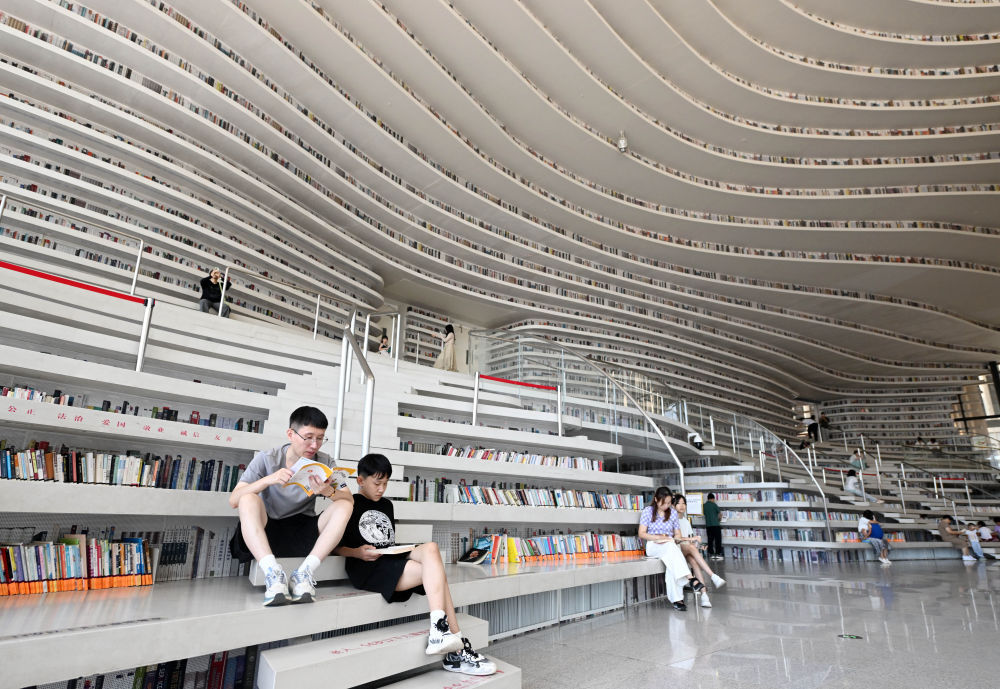 2024年8月27日,市民在天津滨海新区图书馆内阅读。有着“滨海之眼”之称的滨海新区图书馆位于天津滨海文化中心,目前已成为天津滨海新区的文化“新地标”。