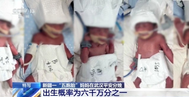 近日,在湖北武汉大学中南医院产科手术室,伴随着五声清脆的啼哭,一位来自新疆和田的24岁妈妈迪丽,在怀孕28周加6天时,通过剖宫产平安诞下五胞胎。目前,母婴生命体征均平稳。专家介绍,全球自然受孕五胞胎的出生概率仅为六千万分之一。