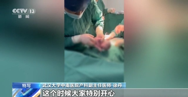 武汉大学中南医院产科副主任医师 徐丹:第一个宝宝非常顺利是个头位,其实头位是最简单的情况。我们拖着这个很小的孩子的时候,挤压他的呼吸道以后,弹他的足跟、拍他的屁股,他哭了,这个时候大家特别开心。