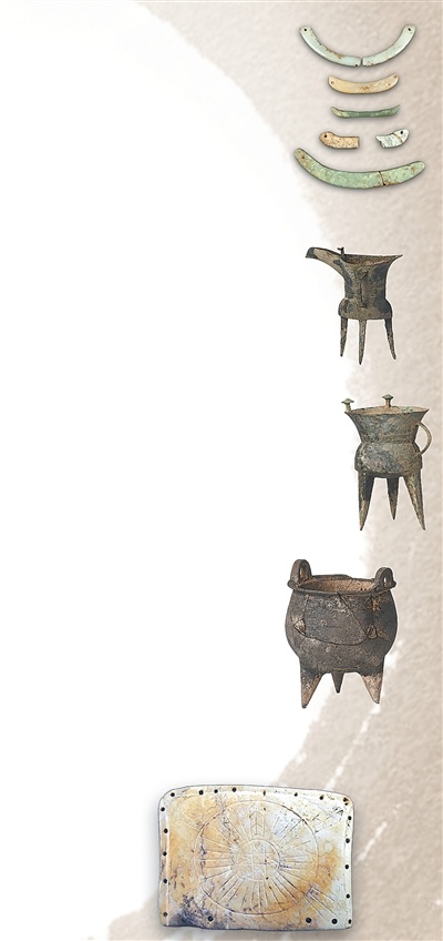 图片自上而下分别为河南南阳黄山遗址出土的玉璜,山西西吴壁遗址墓葬出土的铜、陶礼器,安徽凌家滩遗址出土的玉版。资料图片
