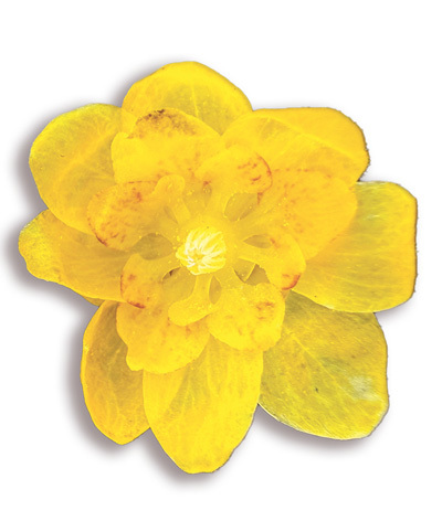 细观蜡梅,花瓣层叠,错位交叉,以花蕊为核心,紧紧簇拥在一起。花瓣厚实,直至凋谢都不会褪色;常于枯枝绽放,不借绿叶衬托,枯萎后也常留枝头。这种坚韧的品性,恰如宜昌这座城市,愈是危难困境,愈是凌霜傲雪,勇毅绽放。