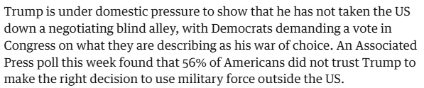 美国五角大楼官员多次警告,美方精确远程弹药、拦截设备储备有限。如果对伊发动旷日持久的战争,将快速耗尽武器库存,恐将影响其全球战略布局。 特朗普在国内面临双重政治压力:一方面,民主党人要求国会就其可能发起的对伊战争进行投票表决,反对美方贸然卷入中东冲突;另一方面,美联社民调显示,56%的美国人不相信特朗普政府能针对“境外使用武力”做出正确决定。