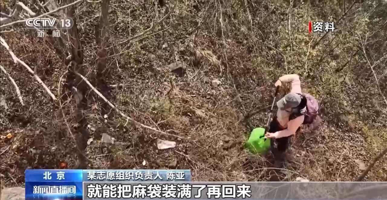 某志愿组织负责人 陈亚:我们每次捡拾基本上至少都是二三百斤起步,虽然在长城主体上看不到,但其实城墙的两侧垃圾非常多。任何一个山坡,只要是秋冬季节叶子都掉光了,拿着麻袋下到山坡里面去,就能把麻袋装满了再回来。