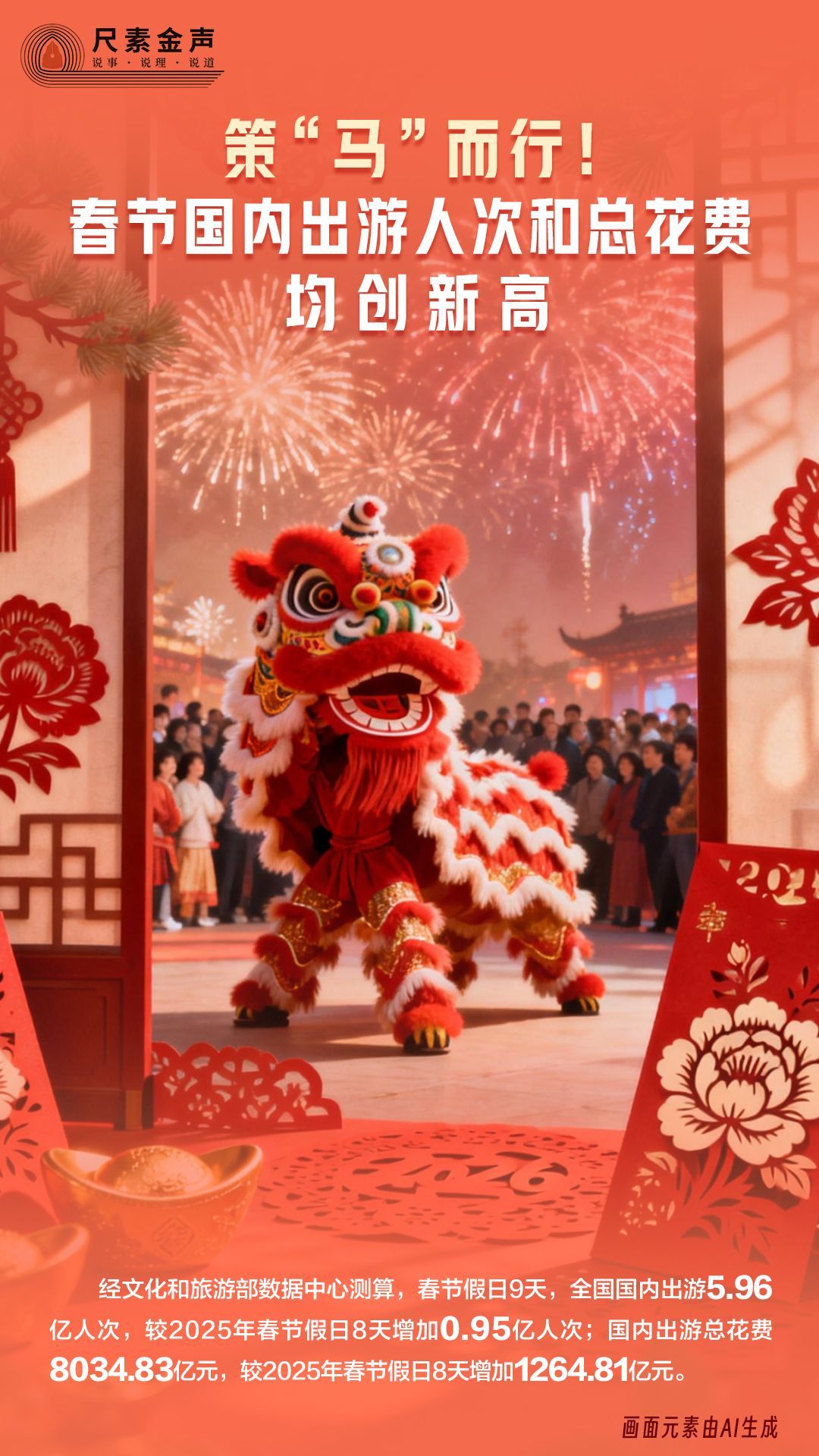 经文化和旅游部数据中心测算,春节假日9天,全国国内出游5.96亿人次,较2025年春节假日8天增加0.95亿人次;国内出游总花费8034.83亿元,较2025年春节假日8天增加1264.81亿元。