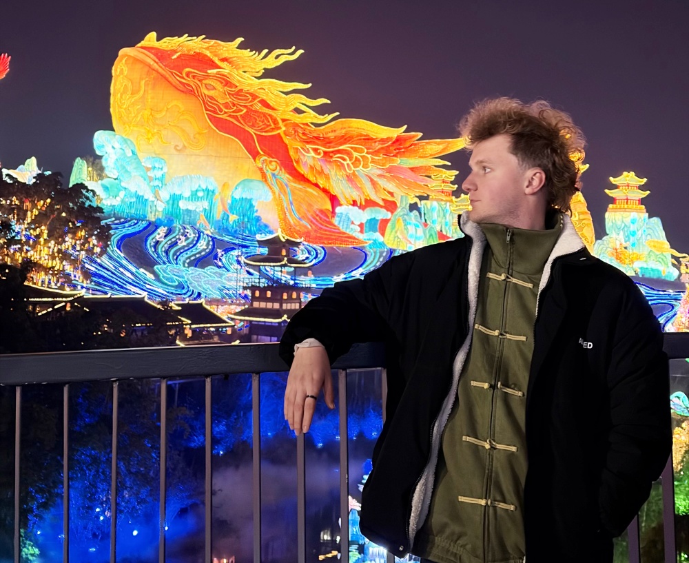 法国留学生在第32届自贡国际恐龙灯会现场拍照留念。新华社发
