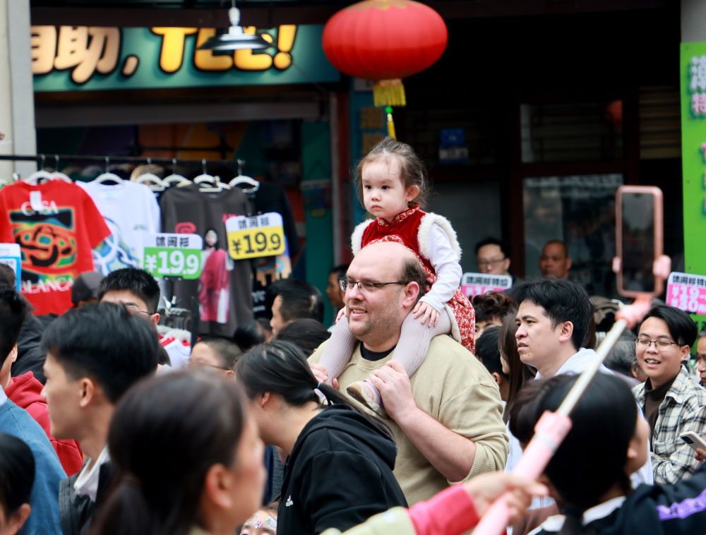 观光客变身年俗“体验官”。在北京,老外们逛庙会、啃糖葫芦、转风车,“比中国人还起劲”;在流光溢彩的上海豫园灯会上,穿着汉服逛非遗集市的老外,“与中国古人别无二致”;在天津古镇,拓年画、赏鱼灯、吃糖墩儿,自称不是“老外”而是“老乡”……
