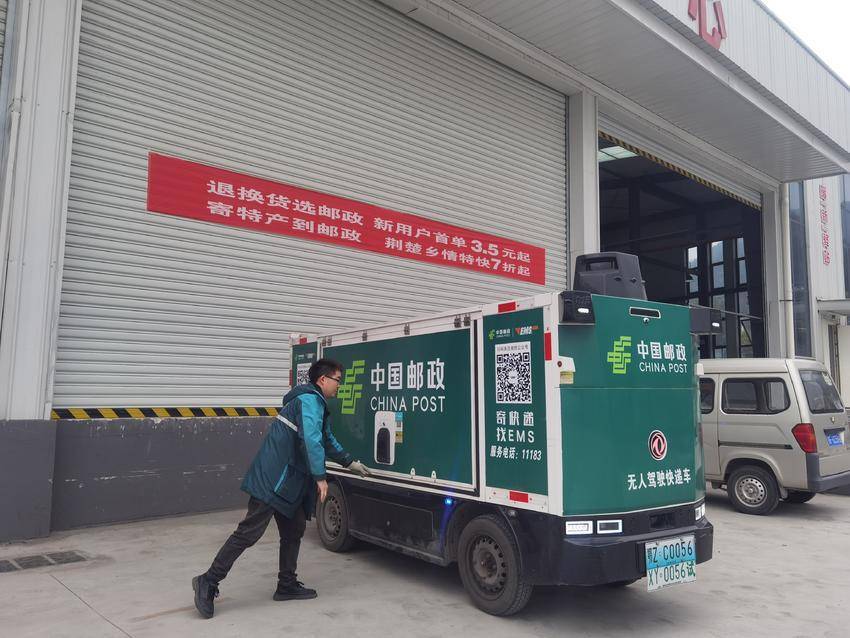 ▼2月28日,在保康县寄递物流共配中心,工作人员将快递包裹装进无人驾驶配送车。
