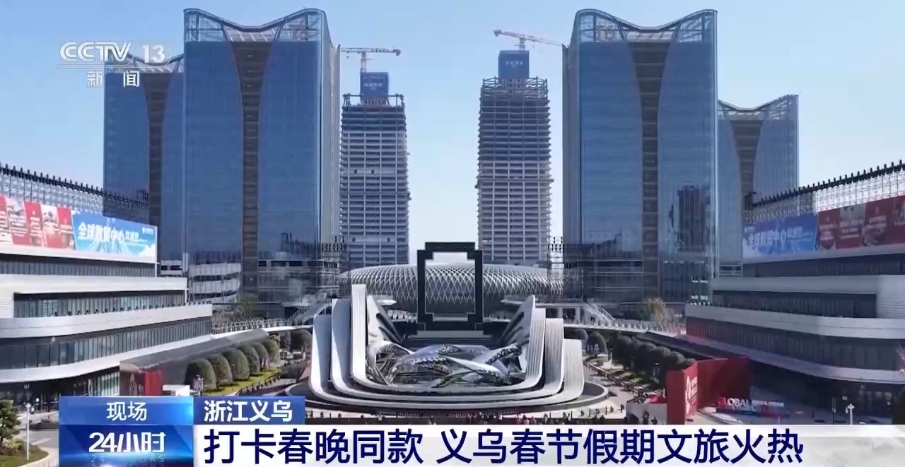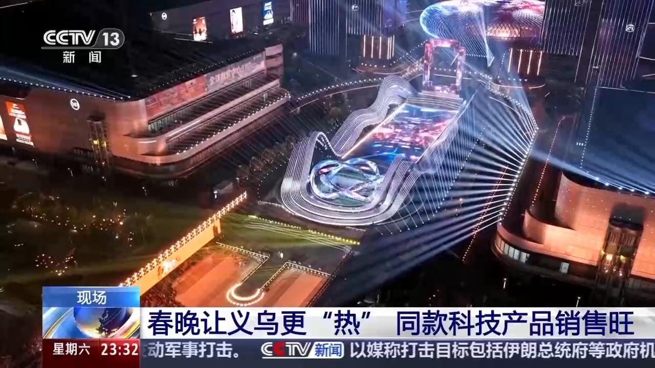 春晚义乌分会场主舞台的背景是一扇中式的窗户,它代表着中国看世界,世界看中国。28日义乌小商品市场全面开市,入夜之后上演了一场与春晚同款的光影秀。