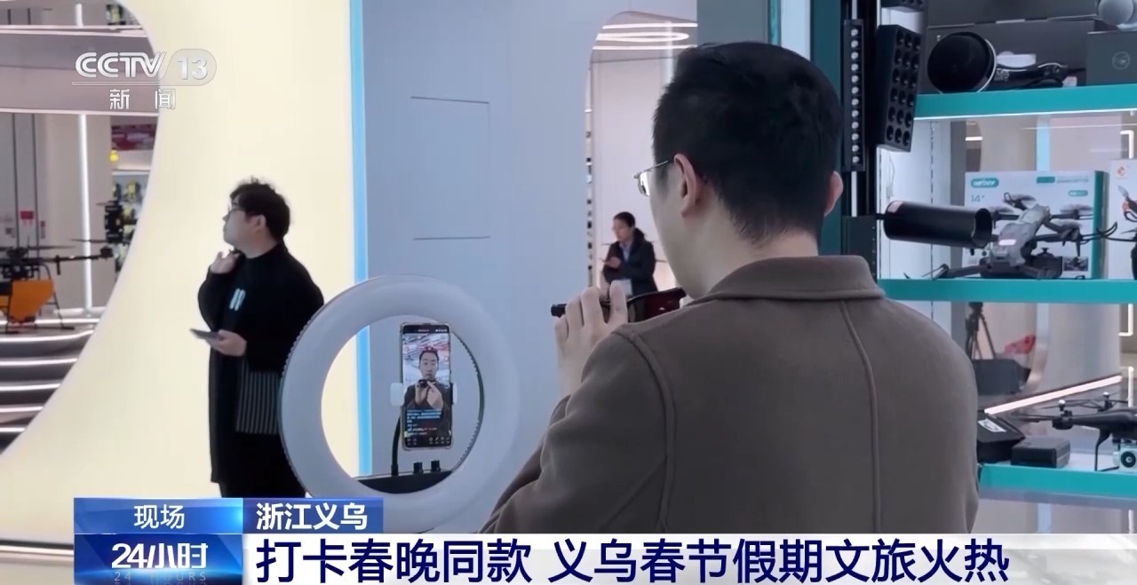 从正月初三开始,每天晚上固定的时间都会有类似的光影秀上演,向市民和游客预约开放,在春节假期的时候,日均的客流量达到了6万人次。 如果说白天看的是舞台的置景,那么入夜之后,光影勾勒出来的就是浙江的山川、又有点像奔涌的钱塘江大潮。除此之外,在整个义乌市区春节假期还有10个“春晚同款”的打卡点。