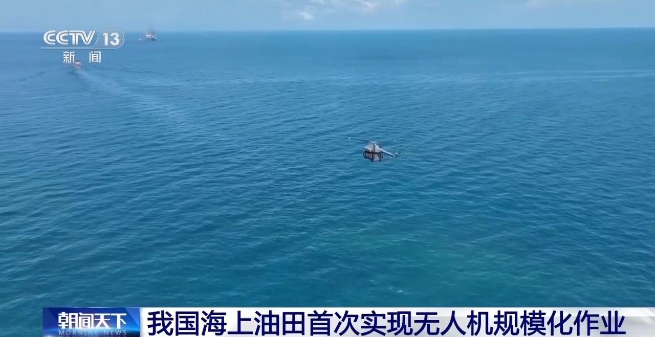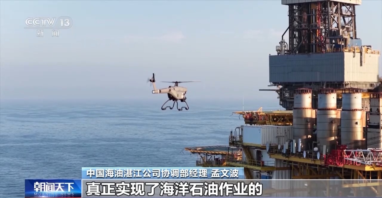 总台央视记者 张伟:在北部湾海域,距离陆地约50海里的涠洲12-1油田中心平台上,一台搭载高清摄像头和红外热成像仪的工业级无人机正在起飞。它能在7级风以下实现全天候智能巡检,1小时就能完成过去拖轮一整天的巡检工作量。