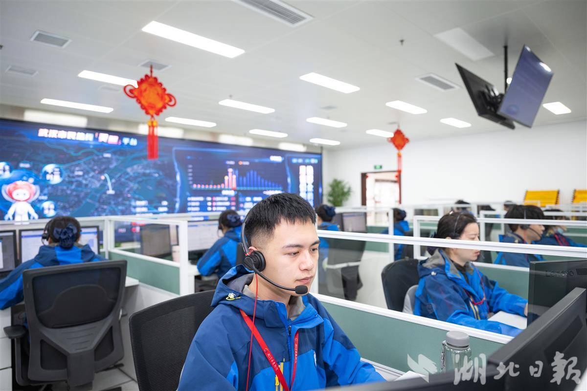 2月28日,在武汉市民热线12345话务大厅,百余名话务员戴着耳机专注接听来电,对面大屏幕上,“灵醒”智能平台实时滚动着来电数量、诉求分类,数据不断刷新。