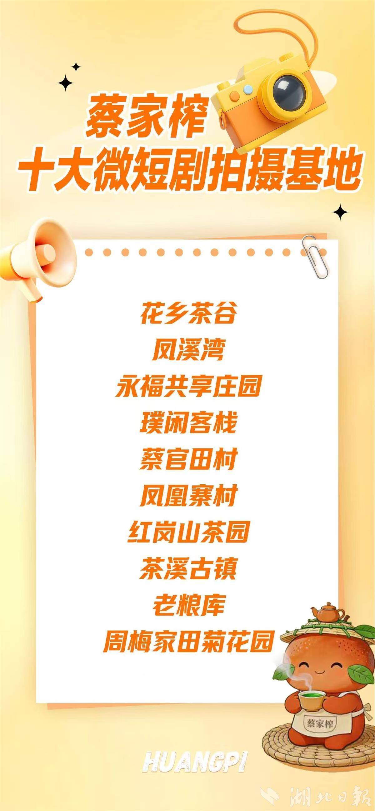据了解,这十大微短剧拍摄基地涵盖了蔡家榨多元风貌,一步一景、处处有戏,既是天然片场,也是文化活动、潮流市集、研学实践的优质承载地。其中,花乡茶谷九千亩生态茶园铺展成海,春日里梅樱同赏,随手一拍皆是春日大片;凤溪湾80间客房推窗见景,溪畔雅居尽显田园静谧;永福共享庄园青砖灰瓦,透着徽派田园温情;璞闲客栈作为五星级民宿,精致雅趣兼具露营野趣;蔡官田村古朴村屋写满乡愁,承载着老蔡榨的岁月记忆;凤凰寨村依山傍水,风景独好;红岗山茶园层层叠叠,尽显时光流转之美;茶溪古镇青石板路蜿蜒,一秒带你穿越古今;老粮库兼具工业风和文艺范,是现成的“创意产业园”片场;周梅家田菊花园花开时节金黄遍野,氛围感拉满。