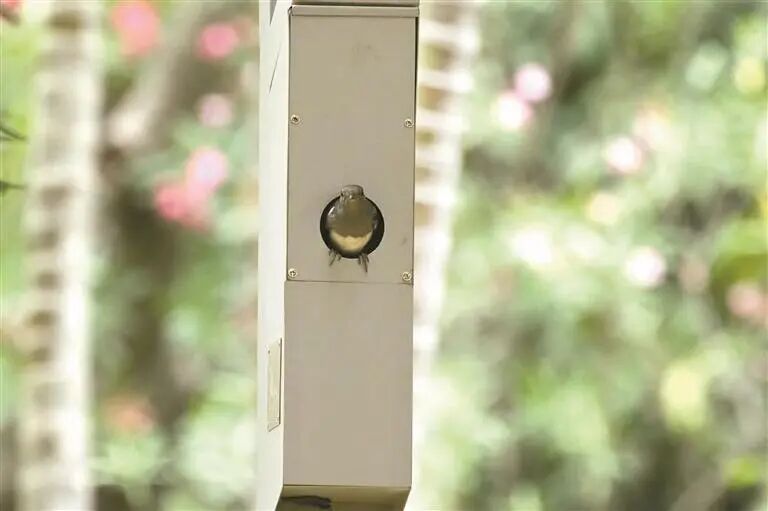 如今,100盏“鸟巢路灯”已在公园落地,其中,40盏带巢箱的灯成了大山雀、鹊鸲的“抢手房源”。