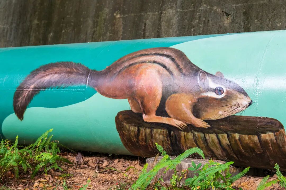 在深圳莲花山公园,兔子、狐狸、树懒、猎豹、斑马、大象等动物被画在了一条长约2公里的再生水管。