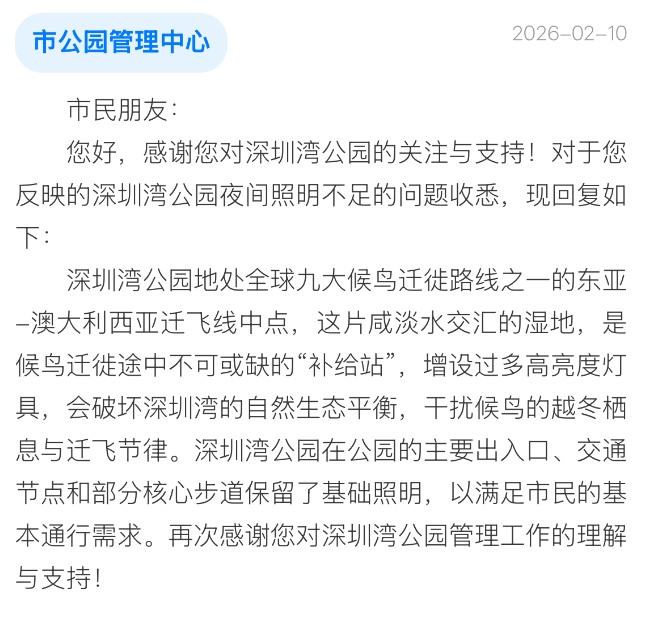 深圳市公园管理中心表示,若增设过多高亮度灯具,将破坏深圳湾区域的自然生态平衡,尤其会干扰候鸟越冬栖息和迁飞节律。