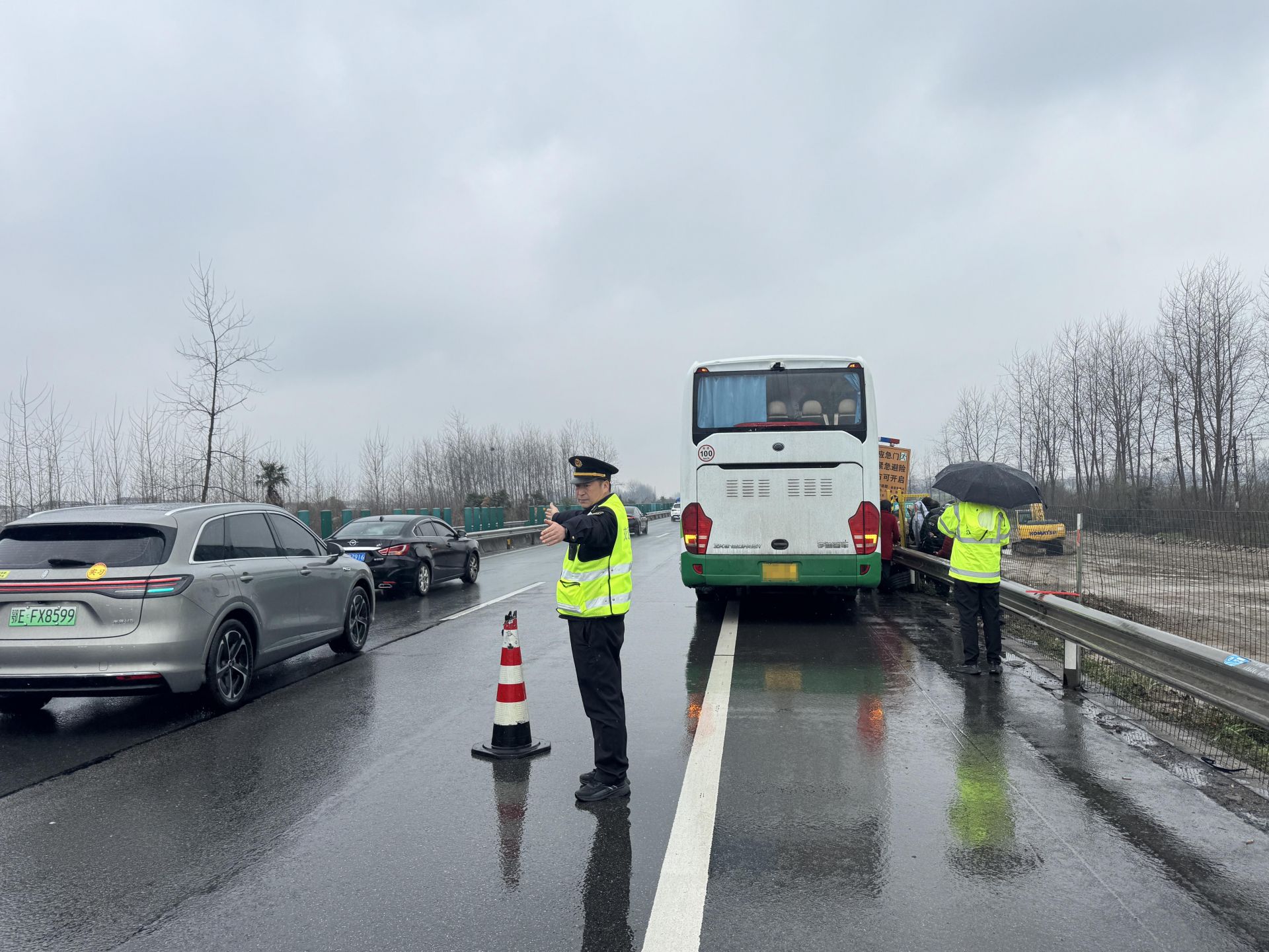 到达现场后,路政执法人员立即按规范在故障车后方安全距离布设反光警示锥桶,引导过往车辆减速避让、划定安全作业区域。同时,耐心安抚车内旅客情绪,引导全员转移至护栏外安全地带,消除人员滞留风险。随后,联合高警、施救单位分工协作,在雨中高效完成轮胎更换作业。