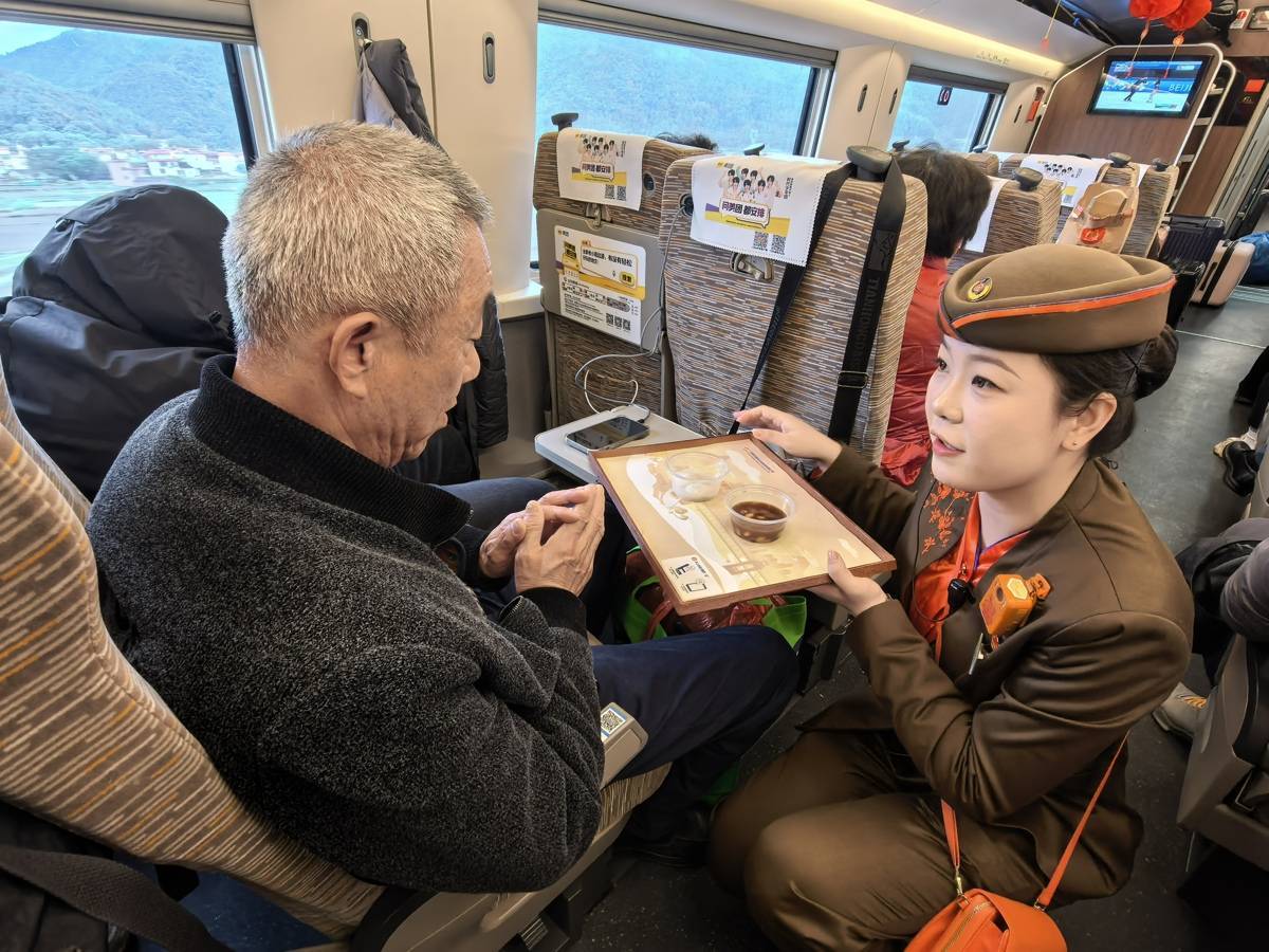 列车员给小朋友送来汤圆。