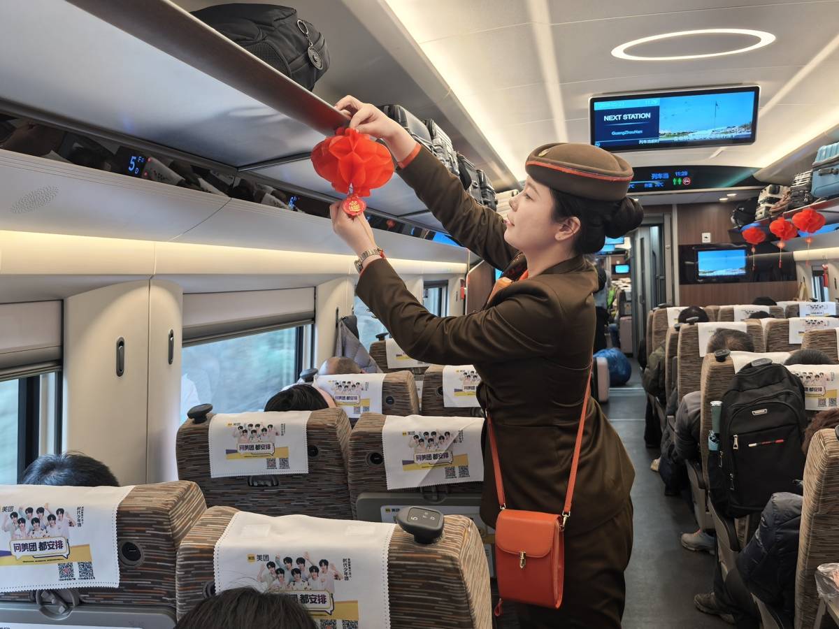 乘务人员精心装扮车厢。