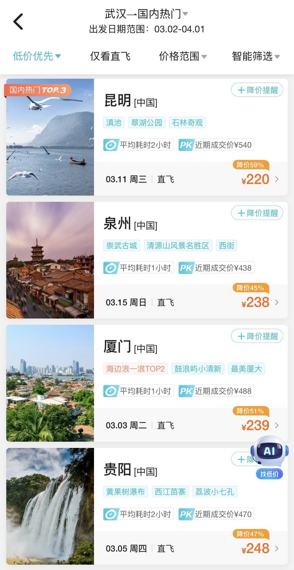 记者查询多个出行平台发现:3月11日武汉飞昆明最低票价仅220元;3月15日武汉直飞泉州约238元;3月13日武汉飞三亚最低379元(均不含机场建设费及燃油附加费)。单程低于400元的机票选择丰富,部分航线价格甚至低于高铁。