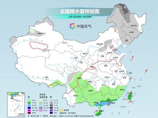 中央气象台预计,今天,内蒙古东部、东北地区大部、华北北部、新疆北疆北部和伊犁河谷、川西高原西部等地部分地区有小雪或雨夹雪,内蒙古东北部、黑龙江西北部等地部分地区有中到大雪;江南南部、华南及四川中南部、云南东部、贵州大部、海南岛、台湾岛等地部分地区有小到中雨,广西东南部、广东中南部等地部分地区有大雨。