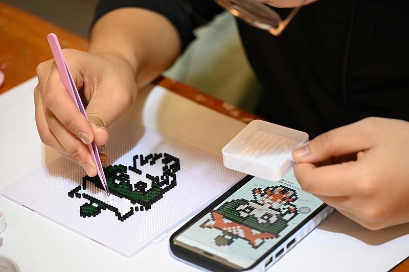 现在,白同学总爱约着好朋友一起来店里拼豆,大家围坐在一起创作,彼此分享想法和技巧,让拼豆作品成为交流的纽带。在她的带动和推荐下,身边也有越来越多的同学被这份手工乐趣吸引。