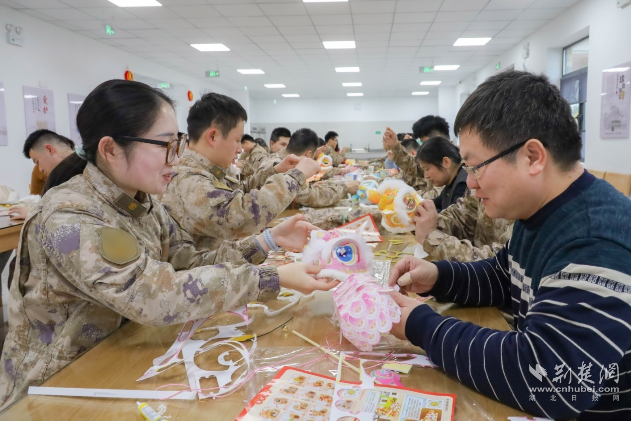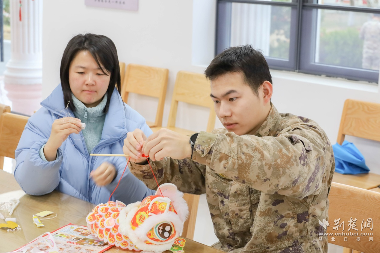活动现场处处洋溢着喜庆祥和的节日氛围。官兵们早已摆好桌椅,备好彩纸、竹篾、糯米粉等材料。“来,咱们一起把灯骨架扎紧,这样花灯才结实。” 活动伊始,做花灯环节便拉开帷幕。江夏区退役军人事务局和区教育局干部与部队官兵们分工协作,折框架、糊彩纸、贴窗花、挂流苏,现场一派热火朝天的景象。大家手中的花灯样式各异,每一盏花灯都承载着军民同心的美好期许。