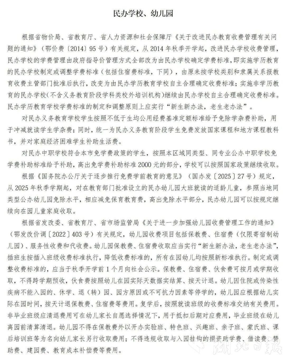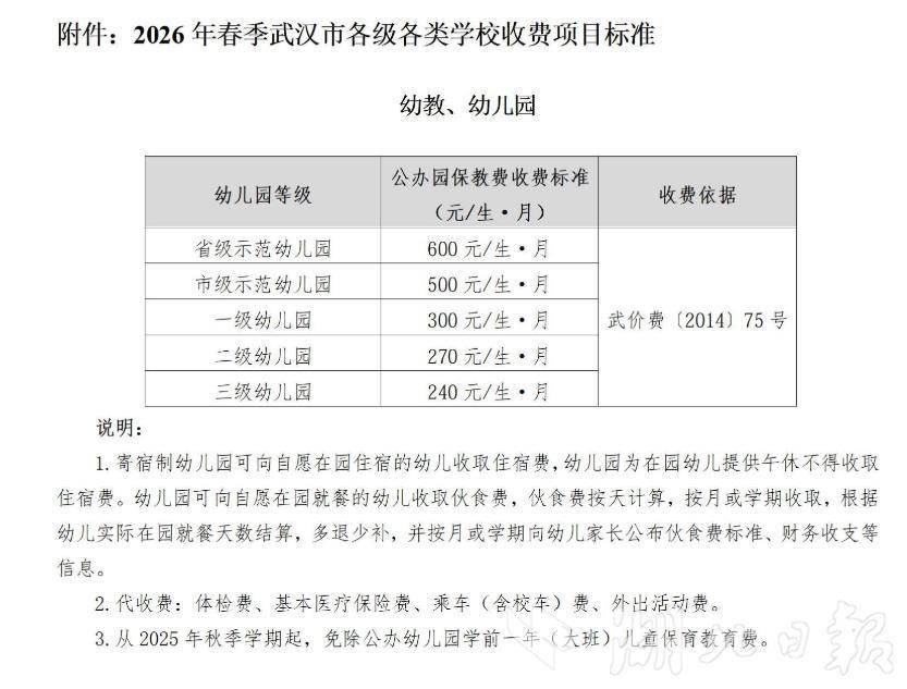 湖北日报讯(记者张倩倩) 开学在即,家长关心的学费怎么收?住宿费等代收费有何规定?3月2日,武汉市教育局、武汉市发展和改革委员会联合发布《2026年春季武汉市各级各类学校收费项目标准公示》,为全市学生家长送上一份详尽的教育收费“明白纸”,并重申对教育违规收费行为实行“零容忍”。