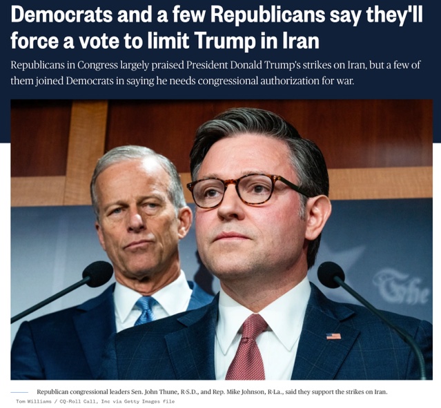 此次争议的直接背景,是特朗普政府对伊朗采取军事打击未事先获得国会明确授权。这一做法迅速引发国会不满,也将一个长期存在却反复被挑战的问题重新推到台前:总统是否可以在未获国会同意的情况下,将国家带入军事冲突。