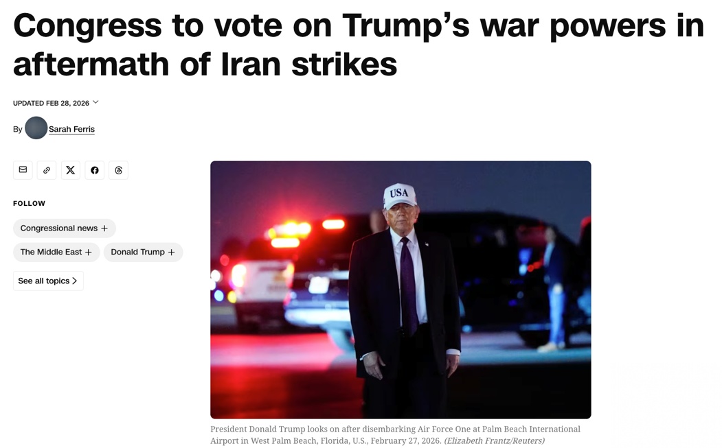 这意味着,随着军事行动展开,总统是否可以在未获得国会授权情况下持续动用武力,已从白宫的军事决策问题,迅速演变为美国国内高度关注的宪政争议。