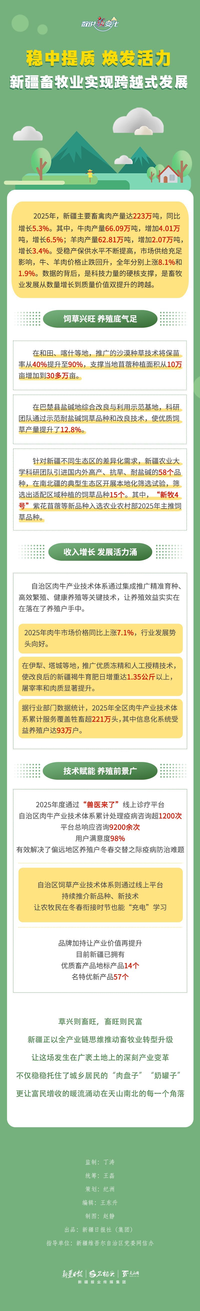 2025年,新疆深入实施畜牧业振兴行动,“牧九条”等政策成效持续显现,畜牧业生产企稳回升、再攀新高,主要畜禽肉产量达223万吨,同比增长5.3%。数据的背后,新疆畜牧业发展的硬核支撑是什么?今天的《数说“新”变化》一起来看看。