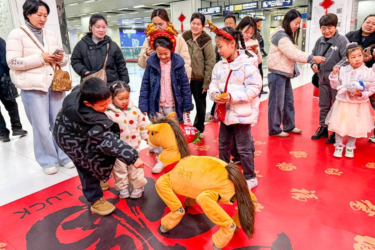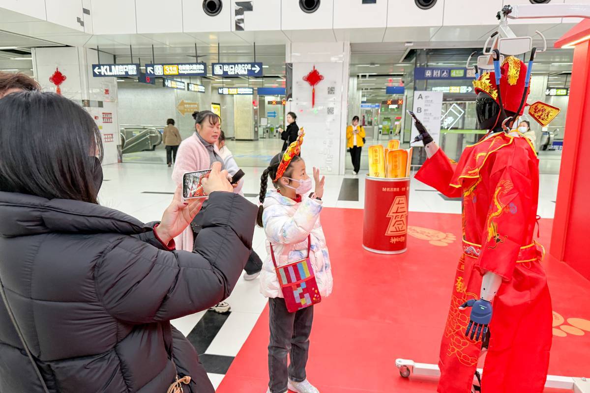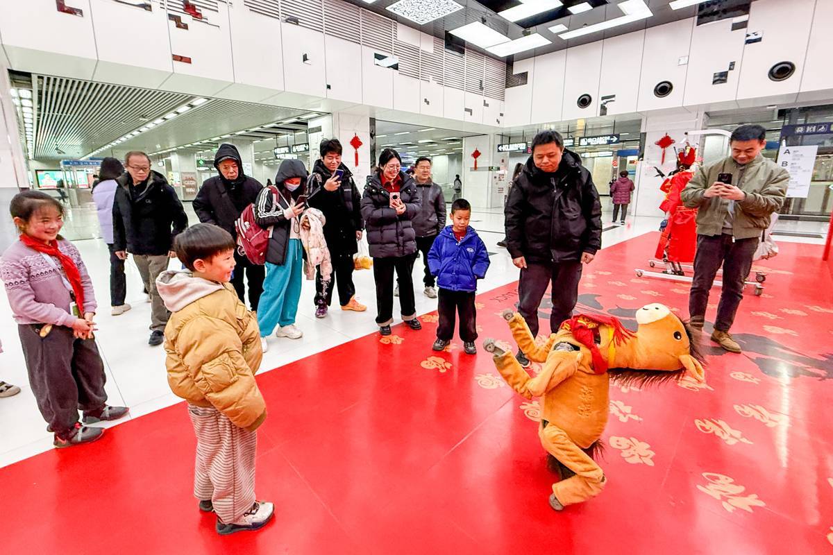 图为市民乘客在武汉地铁王家湾站内与机器人和机器小马互动,庆祝元宵节。