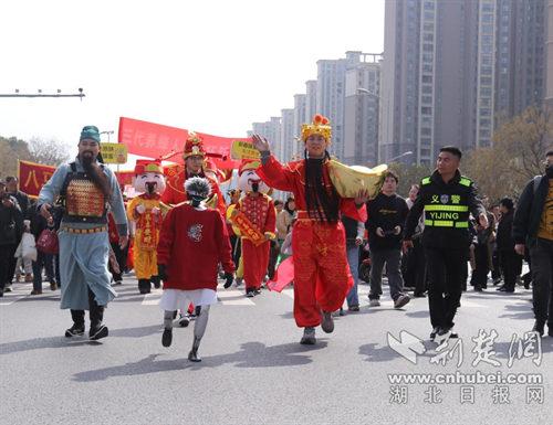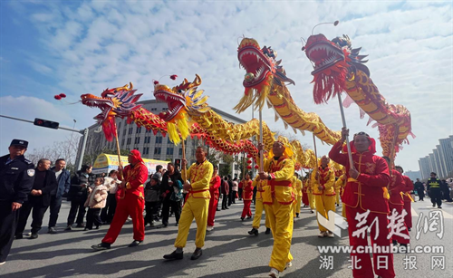 当日13:30起,辖区各镇(街道)参演队伍便齐聚现场,在指定区域有序列队,演员们精神抖擞、道具齐备,静待活动开启。14 时启动仪式正式拉开帷幕,各参演队伍依次出发,沿“区政府— 龙井大道—深圳大道—白云大道—荆门市体育文化中心”路线开启民俗巡游之旅,最终在体育文化中心西广场、南广场进行集中展演。