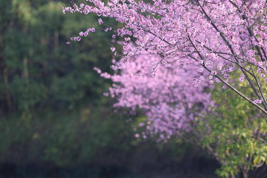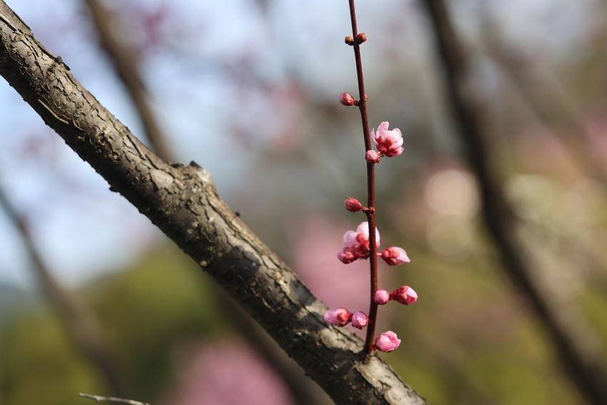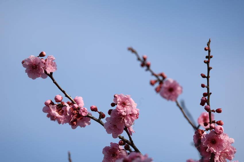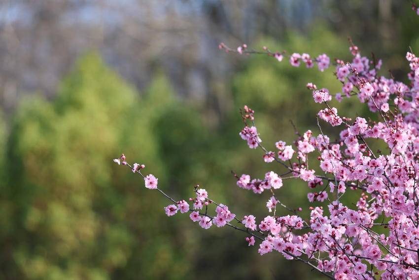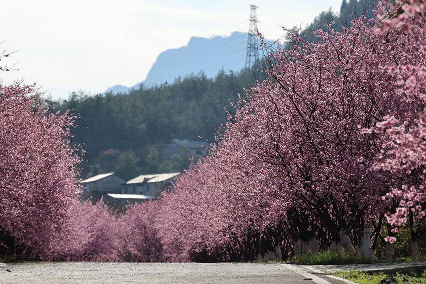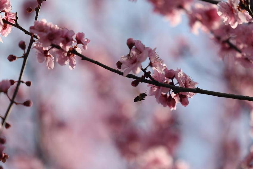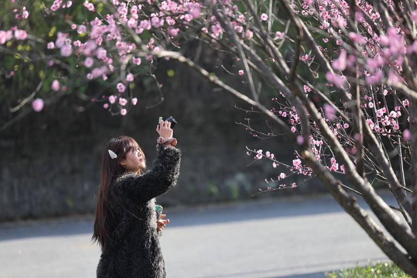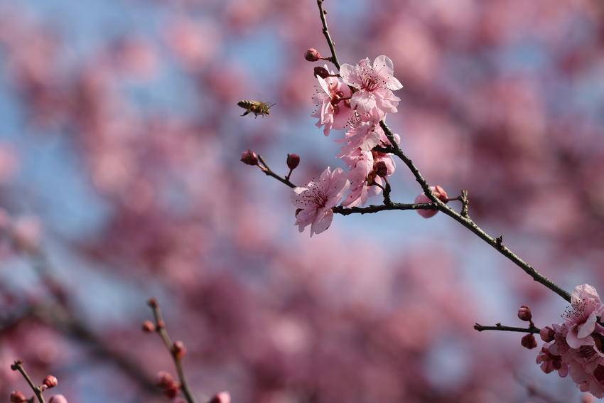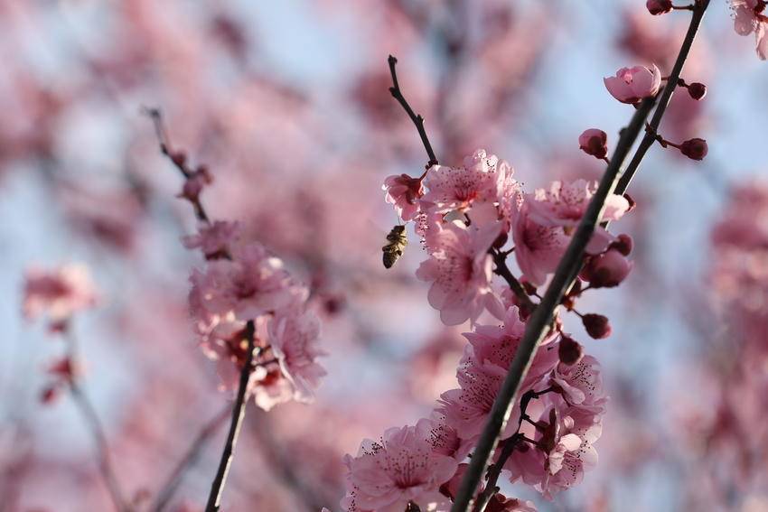 湖北日报客户端讯(通讯员陈美强)3月3日,天气放晴。在湖北省恩施土家族苗族自治州巴东县水布垭集镇清江大道两旁,娇艳夺目的百株情人梅花进入最佳赏花期,吸引了不少游客前来打卡赏花。勤劳的蜜蜂更是纷至沓来,它们穿梭在花间,忙碌地采集着花蜜,为这片花道增添了更多生机与活力。