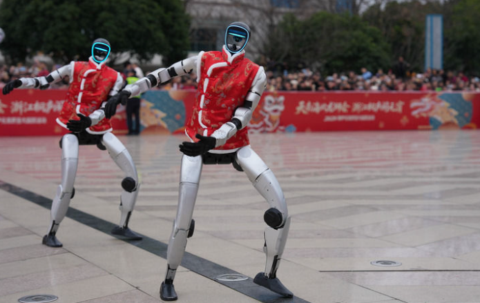 2026年2月28日,宇树科技人形机器人在浙江省桐庐县中心广场表演舞蹈。新华社记者 黄宗治 摄