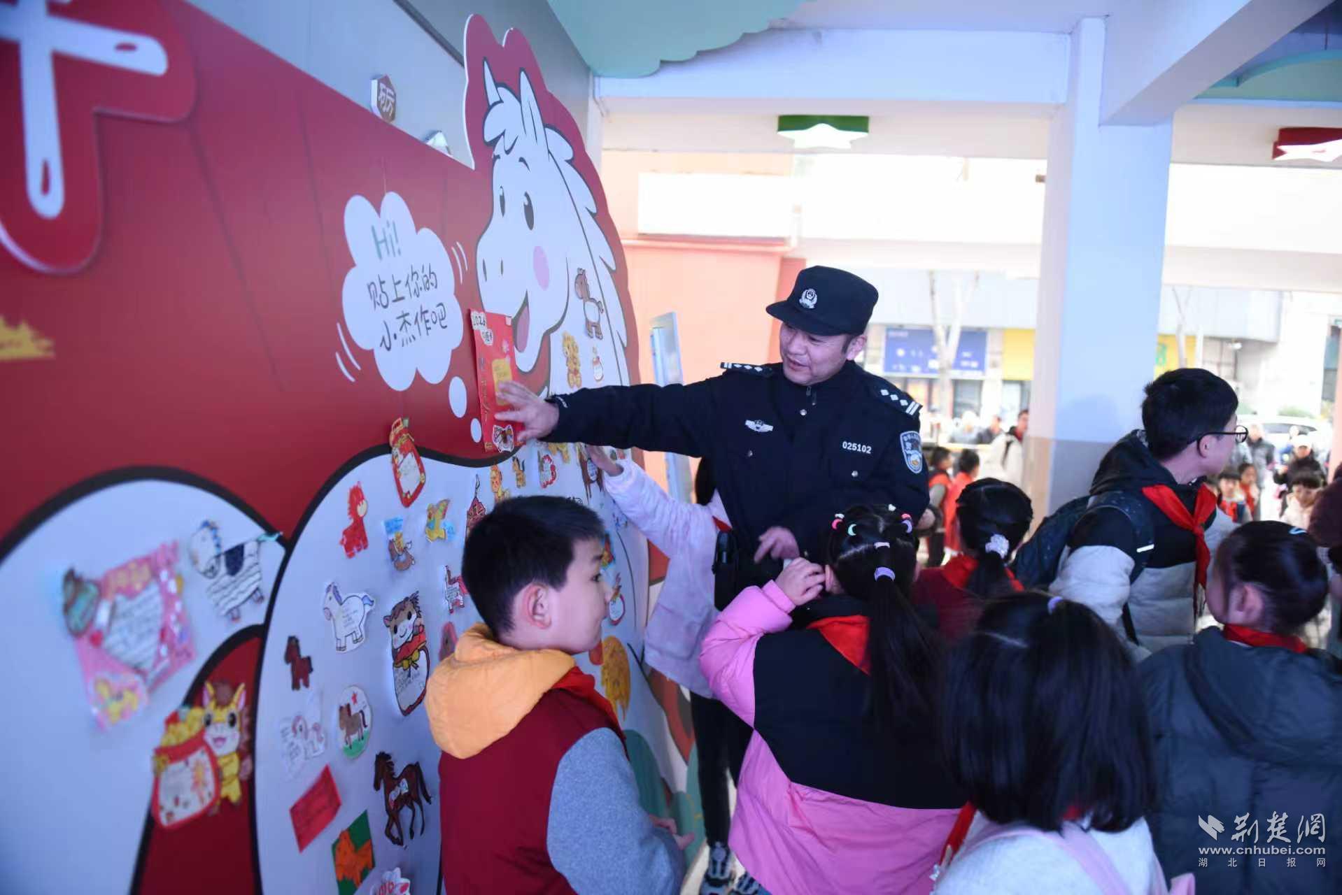 江岸区分局民警加强重点学校周边巡逻,球场所民警夏玉超在武汉市实验小学门前,帮孩子们粘贴新年愿望贴纸,笑着鼓励:“小朋友要加油,叔叔相信你能实现愿望。”江汉区政务大队联合民意所走进友谊路中学,民警向师生家长讲解:“下周我们上门办证,大家提前准备好户口本即可。”