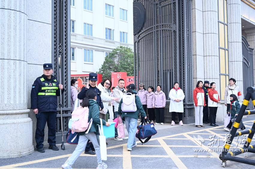 “新学期要平平安安!”武汉市育才实验寄宿小学门口,塔子湖派出所民警华丽的声音融进春日暖阳,为开学第一天注入安全气息。