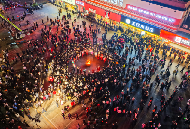 在另一边的舞台,文艺演出接连登场、精彩纷呈。经典民俗元素与舞蹈节目相互交融,台上精彩不断,台下掌声阵阵。夜色渐深,篝火熊熊燃起,市民围火共舞,在跃动的火光中共享团圆时刻,将现场氛围推向高潮。