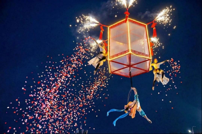 当夜幕降临,华灯初上。伴随着悠扬乐声,身着仙鹤元素服饰的“飞天仙鹤”舒展长袖、翩然起舞,将承载祝福与祥瑞的花瓣洒向人群,氛围感拉满。“鹤自古在我们中国人的传统中代表着吉祥、长寿、如意,所以今天很荣幸能够来到崇尚鹤的古城江陵,能够在这里演出。”演职人员程程说道。