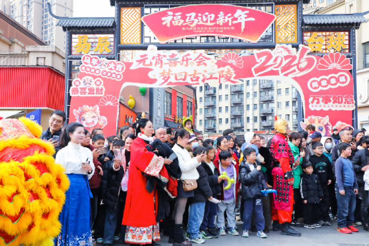 荆楚网(湖北日报网)讯(通讯员 王思维 宋珍妮)3月3日,荆州市江陵县中央金街商圈人头攒动、热闹非凡,一场以“元宵喜乐会·梦回古江陵”为主题的元宵节活动火热上演。民俗文化巡游、天女散花、传统手工艺展示、篝火晚会等活动内容丰富多彩,浓浓年味直接拉满。