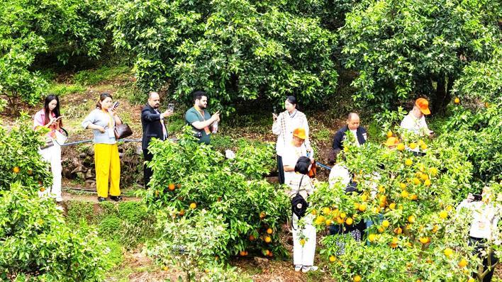 多国脐橙采购商在秭归橙园体验脐橙采摘。 (彭强 摄)