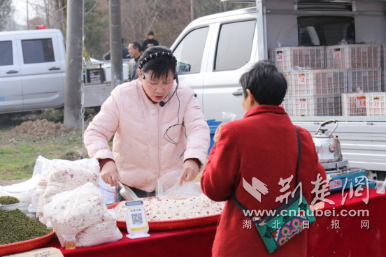 樱花谷旁的农副产品展销区同样人气火爆。栗溪熏肉、荆山土鸡、野生蜂蜜、山间笋干等本地特色农产品整齐摆开,村支部书记和农户们热情地向游客介绍产品。摊主赵大爷的熏肉摊位前围满了人,他一边切肉一边笑着说:“今天带了一百多斤熏肉,不到中午就卖得差不多了,好多游客加了微信,说以后直接找我买。”不少商户的存货销售一空,还接到了后续订单。