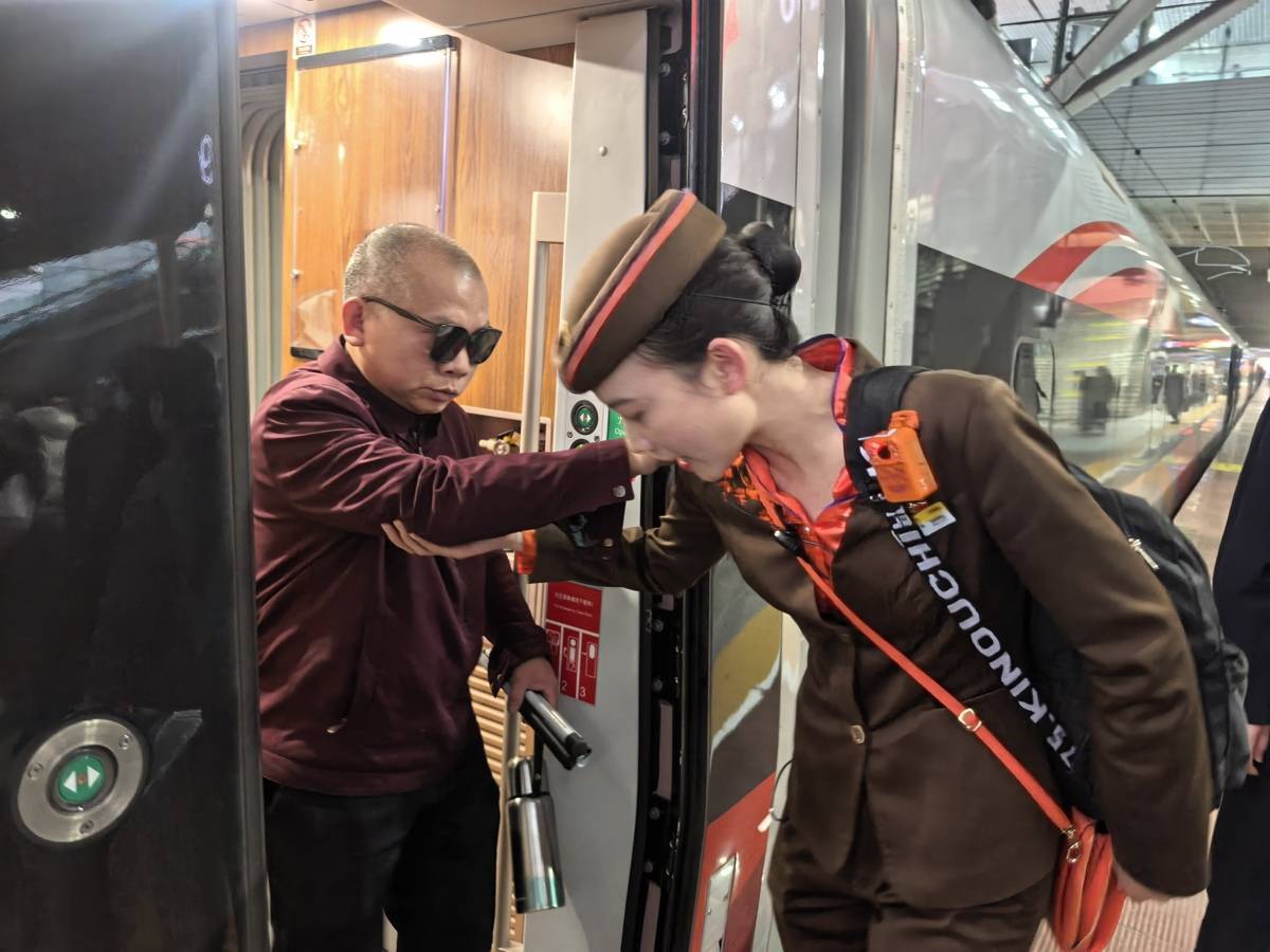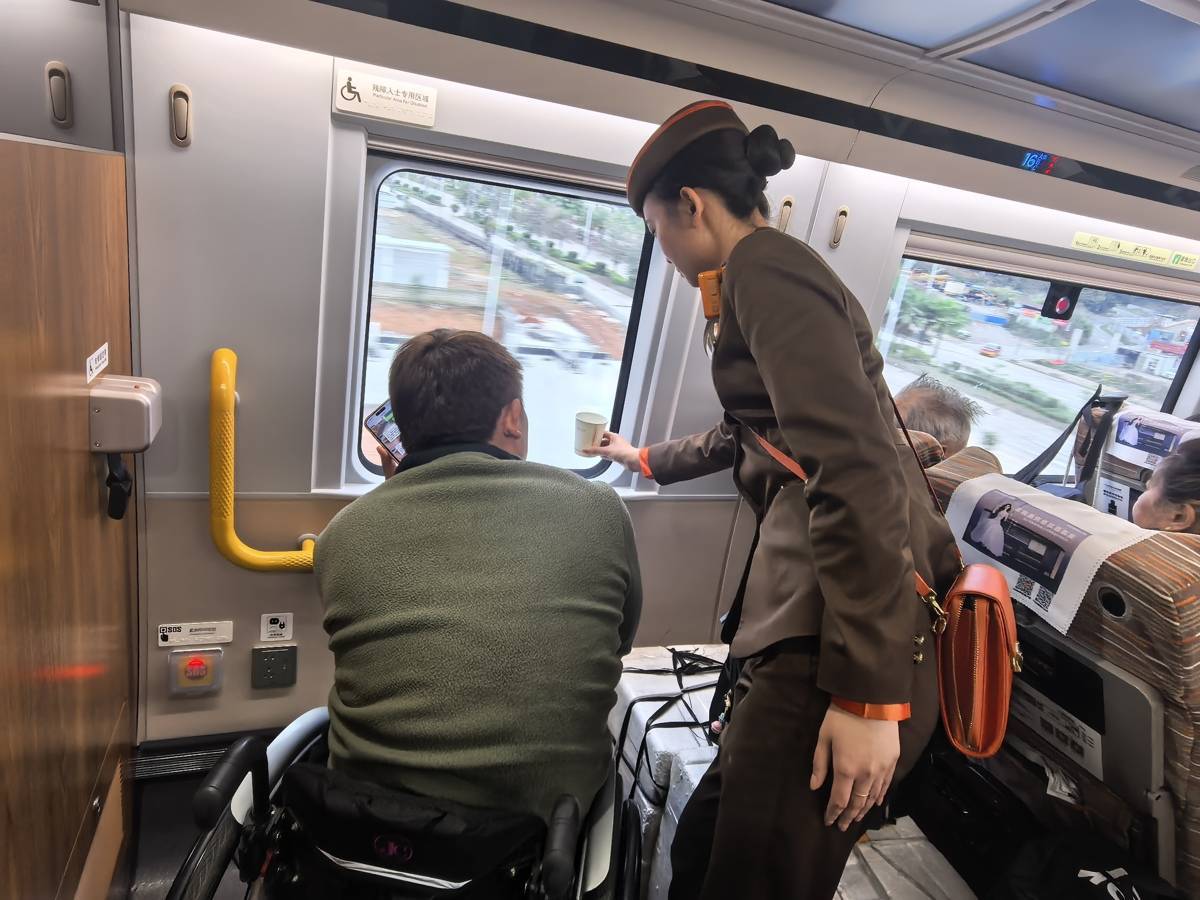 乘务员为残障旅客服务。