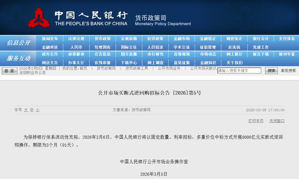 央行公告,为保持银行体系流动性充裕,2026年3月6日,中国人民银行将以固定数量、利率招标、多重价位中标方式开展8000亿元买断式逆回购操作,期限为3个月(91天)。