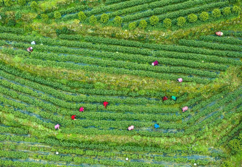 图为3月5日,湖北省秭归县茅坪镇建东村村民在御子堂生态茶园除草,为采茶做准备(无人机照片)。